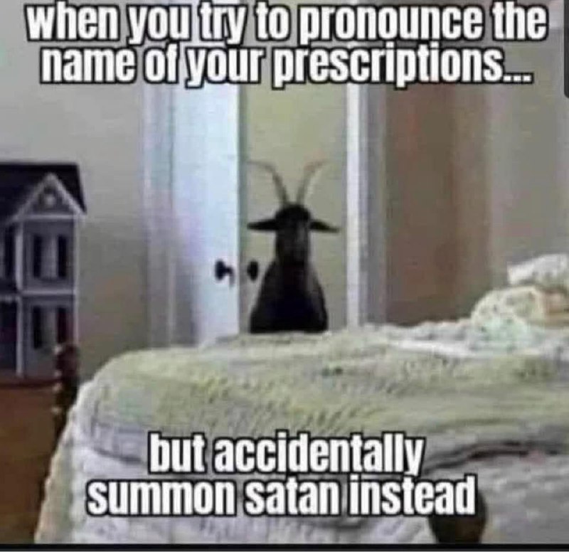 That awkward moment when you try to pronounce your medication's name and accidentally summon the dark lord. Well, this is awkward. 🐐