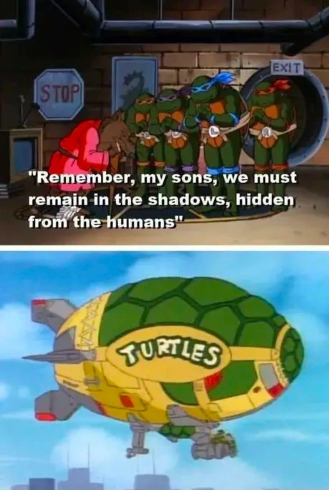 Splinter's stealth training program seems to have some... inconsistencies. Nothing says 'hidden' like a giant blimp with your name on it. 😂