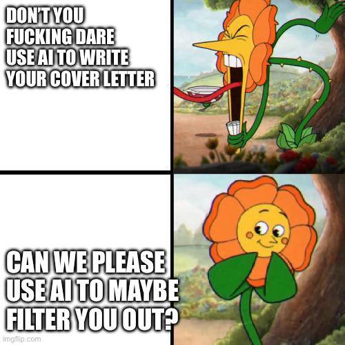 The hypocrisy is strong with this one. Recruiters expect a heartfelt, human-written cover letter, only to have their AI toss it in the bin. ๐Ÿค–