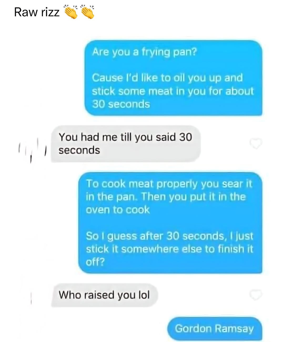 The Gordon Ramsay method for scoring a date: sear for 30 seconds, then finish it off somewhere warmer. 😉