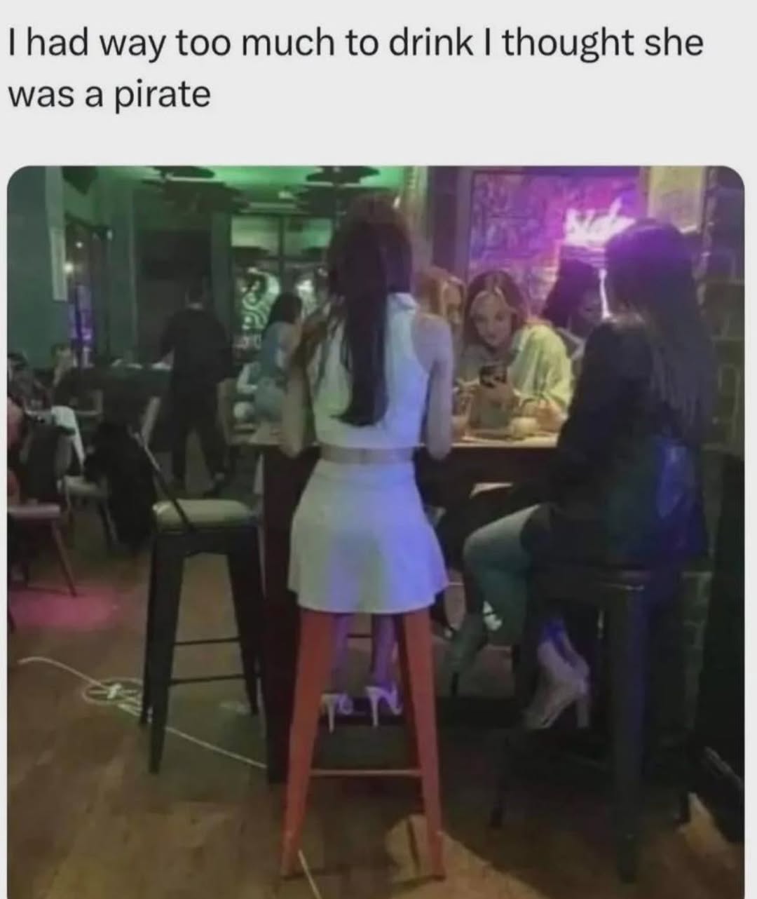 That moment you realize it's the bar stool, not a pirate with two peg legs. Time to go home. 🥴
