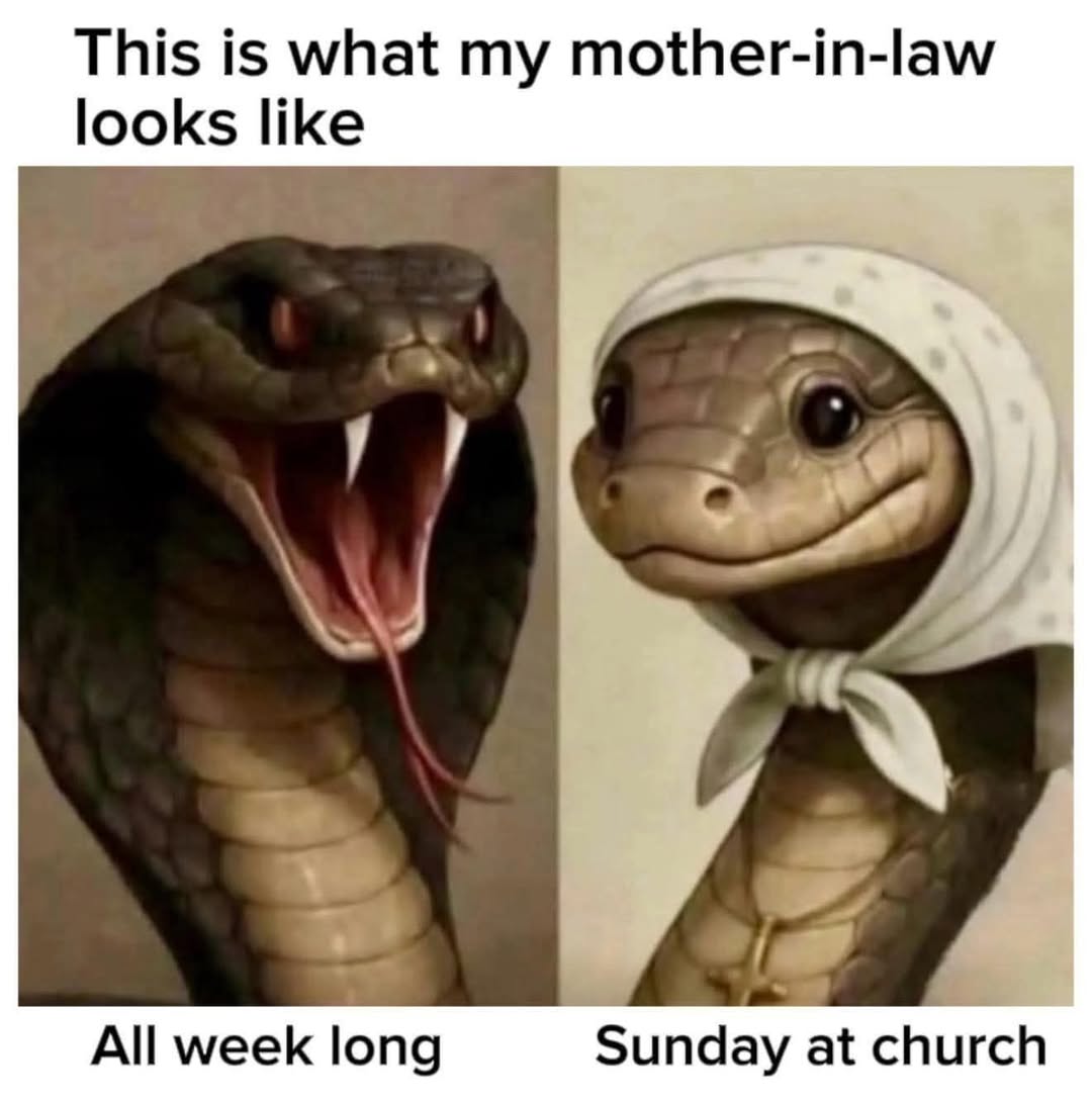 She's a devout saint for one day and a venomous serpent for the other six. The duality of the mother-in-law is truly a sight to behold. 🐍😇