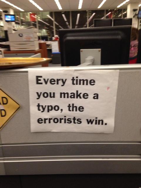 Found this sign in the office. The war on typos is more serious than I thought. Don't let the errorists win!